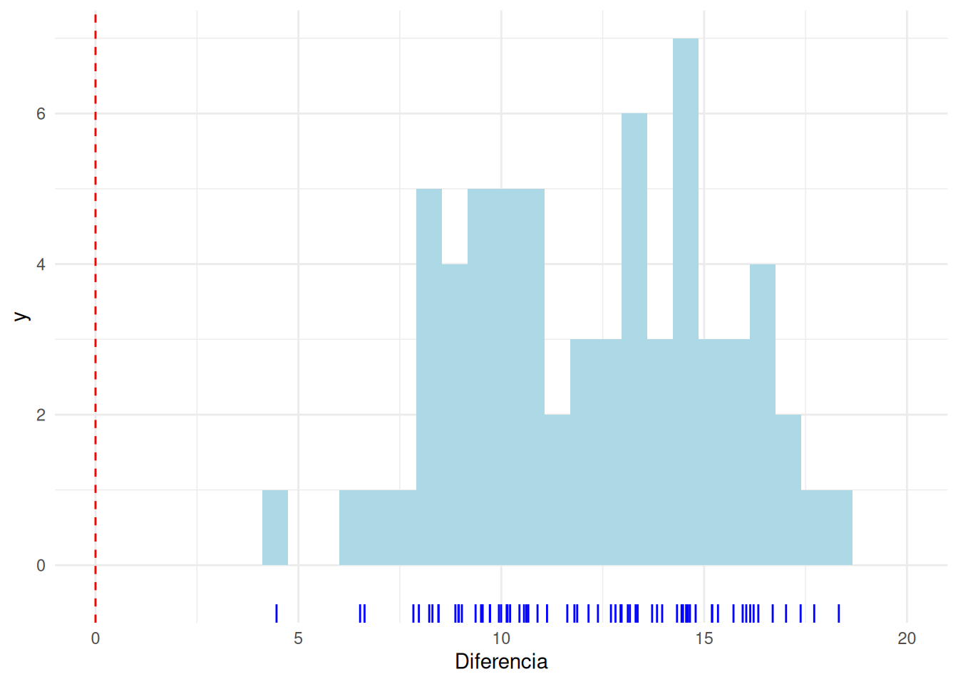 Ya que los datos están ordenados de forma que los peores resultados se muestran primero, y estos han experimentado mejoría, parece que evidentemente vamos a encontrar gran diferencia en contra de la hipótesis nula. Veamos qué distribución presentan las diferencias: