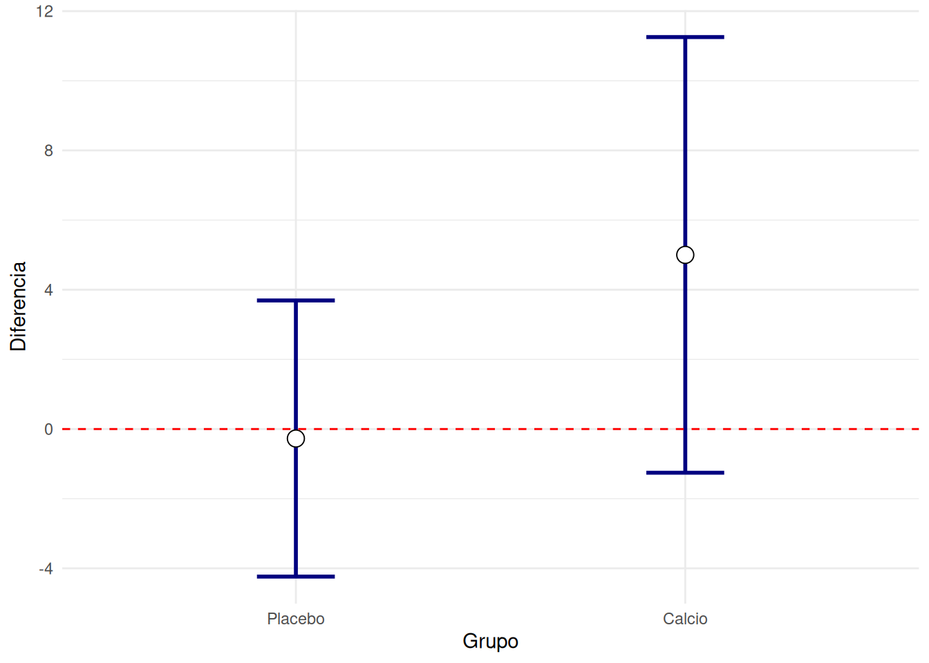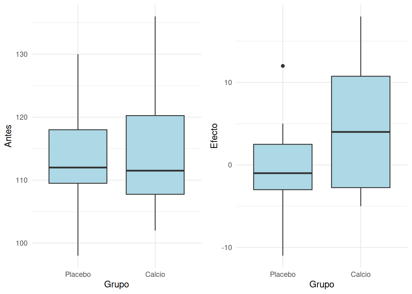 Se aprecia que los dos grupos eran similares al iniciarse el experimento. Sin embargo el grupo de que tomo el Placebo practicamente se quedó igual, y el que tomó Calcio experimentó una mejoría. Nos queda por saber si esta mejoría es explicable por el azar o va más allá (diferencia estadísticamente significativa entre grupos).
