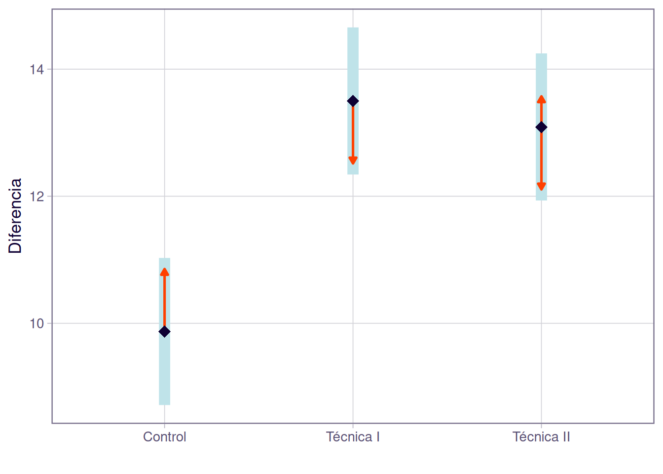 plot(comparisons=TRUE)+xlab("Diferencia")+ylab("")+coord_flip()